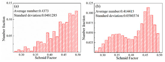 During the plastic deformation process, the roughness of the specimen’s surface changed significantly, which was closely related to the crystallographic orientation [28]. The crystallographic orientation with regard to the applied stress controlled the plastic strain, which was produced inside each grain [29]. The crystallographic orientation could be characterized by the Schmid factor. Grains with a low Schmid factor were deformed with difficulty, while the greater number of hindrances and grains with a high Schmid factor were easily deformed due to fewer hindrances. Figure 8 displays the Schmid factor maps of aged specimens and fractured specimens at different aging times. It can be observed that the Schmid factor values of each grain in the aged specimens were different (Figure 8a,c,e). Compared with the aged specimens, the Schmid factor values of the fractured specimens decreased (Figure 8b,d,f). This indicates that the Schmid factor values of the grains gradually decreased during plastic deformation, and the deformation of the grains became more and more difficult.