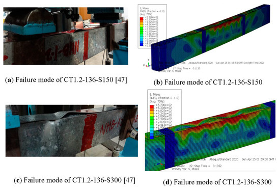 The experimental and FE failure modes of cold-formed steel built-up open section OT1.9-136-S150 and OT1.9-136-S300 are illustrated in Figure 17. Similarly, FE failure modes comparison of cold-formed steel built-up closed section CT1.2-136-S150, CT1.2-136-S300 and CT1.2-136-S600 are illustrated in Figure 18. Since failure modes were observed to be similar from both experimental and FE failure modes, it can be concluded that the developed FE models well predict the failure mechanisms of built-up sections.