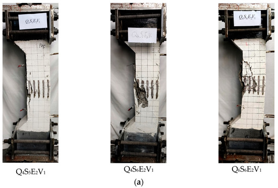 Failure modes of specimens: (a) the failure mode of the specimens with small relative eccentricity; (b) the failure mode of the specimens with large relative eccentricity.