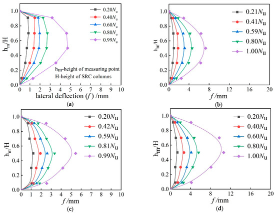 Figure 7 shows the load-lateral deflection curve for specimens with different steel. At the early loading stage of loading, the deflection at the mid height section of the specimen increased slowly. When the load reached 80% of the ultimate load, the deflection of the mid height section increased remarkably. When the relative eccentricity was 0.6, the lateral deflection of the specimens with Q235 steel increased to 158.2% of that of the specimens with 80% of the ultimate load. In addition, the specimens with Q460 and Q690 steel increased to 189.5% and 254.0%, respectively. When the relative eccentricity was 0.2, the deflection under the ultimate load at the mid height of the specimens increased with the increase of the steel strength. In addition, the lateral deflection of the specimens with Q235, Q460, and Q690 steel increased, respectively, to 162.2%, 163.1%, and 144.7% of that of the specimens with 80% of the ultimate load.
