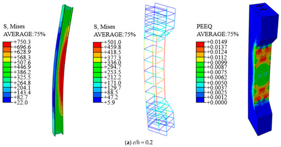 Table 6 presents the calculated results of the bearing capacity of the specimens by the finite element model. For both specimens Q6S6E2V1 and Q6S6E6V1, the calculated results are less than the test results. As shown in the Figure 18, when e/h = 0.2, the compression and tension flanges of Q690 steel did not yield. In addition, only the longitudinal reinforcement in the compression zone yielded, while it did not yield in the tensile zone. The maximum strength of the compression flange was only 64% of the yield strength. When e/h = 0.6, only the compression flange of Q690 steel yielded, while the longitudinal reinforcement in the tension and compression zones yielded together. These results are in good agreement with the test results.
