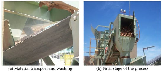 In this work, construction and demolition waste was used to produce both fine and coarse recycled aggregated (RA) in replacement to usual aggregate to produce concrete. The waste used came from a civil construction recycling plant and its composition contains materials from several origins like excavation residues, demolition of simple and reinforced concrete elements, the residue of ceramic masonry materials—bricks and tiles—and also mortar cement-based bricks and mortars. Before processing the RA, an initial manual separation was carried out to remove materials such as wood, plastic, and plaster. The material is, then, taken to a RA recycling plant where it begins its processing that can be summarized as it follows: (a) feeding and pre-screening, (b) aggregate scrubbing, (b) contaminant removal, (c) metals and others undesirable materials removal, (d) sand washing, (e) aggregate sizing, (f) primary stage water treatment, and (g) deposited in bags according to their granulometry. Figure 1 shows a general view of the RA recycling plant.