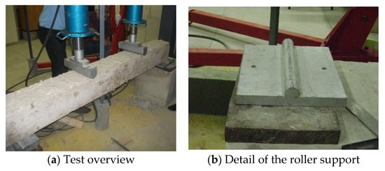 Three 2.20 m reinforced concrete beams with a square cross-section with a side of 20 cm were prepared, one made with the reference concrete and the other two beams made with concrete with full replacement of both types of recycled aggregates studied. The tests on beams were performed according to Brazilian standard NBR 12142 [] which recommends the use of elements with square cross section. Tests performed in beams are, in fact, flexural strength test that are often used to measure the tensile flexural strength of concrete. Although this test is usually performed in unreinforced concrete beams, in the current research it was adopted to investigate the bending behaviour of reinforced concrete beams, using concrete produced with different types of aggregates. Steel roller support placed over rigid concrete blocks were installed at both ends of the beam and this scheme avoid displacement/settlement of supports. The only possible displacement allowed is the rotation normal to the plane of the beam.