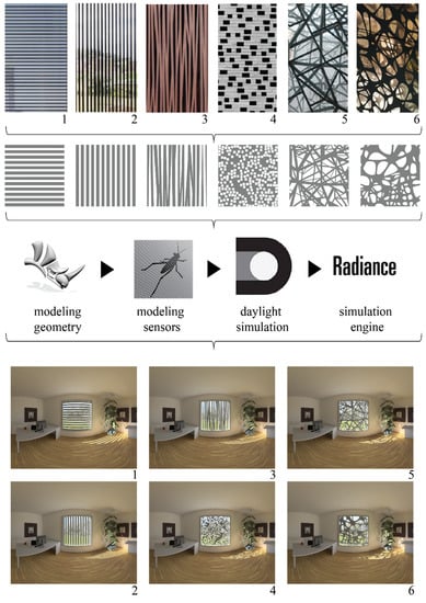 To allow daylight simulations, all modeled surfaces were assigned materials with specific reflectances in DIVA. The RGB reflectance, specularity, and roughness of the primary materials are listed in Table 1. Figure 1 illustrates the selected building skin patterns, the software used to create the digital models and light analysis, and 360° HDR renderings of the interior spaces with different skin variations.