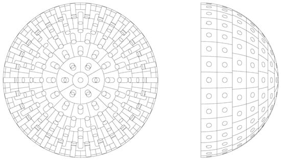 Facade photometry is a bi-directional technique that uses custom sensors modeled on the concave face of an imaginary hemispherical surface [,]. The sensors in this experimental study face the window and follow the direction normal to the surface of the hemisphere. Each sensor possesses an XYZ coordinate location, viewing directions, and an opening angle constrained by an absorbing black cylinder that can be used to assess their FOV. Different discretization of the surface for sensor location and FOV can be used depending on the aim of the project and the complexity and intricacy of the building skin design. In this study, the hemisphere was divided into equal patches, similar to the Tregenza sky model [], resulting in 145 sensors, each located in the center of individual patches, as illustrated in Figure 2.