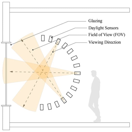 The hemisphere faces the glazing. Thus, the sensors are in close proximity to the facade and each sensor views a portion of the interior space based on its 25-degree FOV (Figure 4).