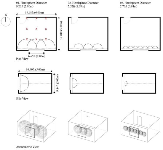 To determine the optimal size and location of the hemisphere in the room in relation to the window, different locations and three different dimensions were tested (Figure 5).
