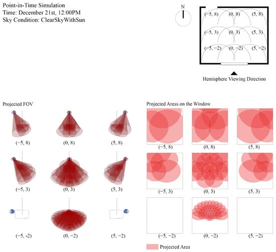 Since this exploration focuses on the entire façade design independent of the location of the occupant, based on the analysis shown in Figure 6 and Figure 7, if the largest hemisphere in location (0, −2), i.e., closest and centered on the window, is selected and the overlit areas that this location highlights are addressed, then all overlit areas highlighted by other hemisphere locations are addressed as well.