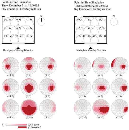 As luminance is a key metric closely related to how the human eye perceives brightness and contrast, luminance and vertical eye illuminance measurements become key variables in assessing the performance of the facade and its effect on the environment it encloses relative to occupants’ perceptions of daylight distribution [,]. Previous research studies have also shown the correlation between vertical illuminance at eye level and glare perception []. This study illustrates how luminance distributions can be efficiently calculated using illuminance-based simulation metrics, which allow for simpler calculations and post-processing.