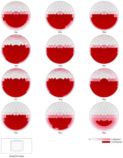 Monthly averages using Annual Daylight Simulation. Average luminance levels above 2000 cd/m2 are shown in dark red.