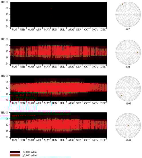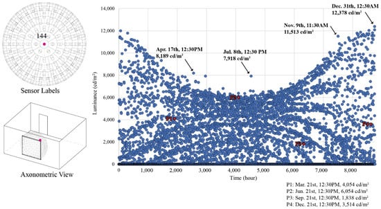 Additionally, with the facade photometry method, hourly luminance values of the sensors can be easily graphed and examined (Figure 16). As shown in Figure 16, the hourly luminance values of sensor 144, located in the center of the hemisphere, range between 0 and 14,000 cd/m2. Current methods of evaluating lighting conditions using the conventional times, i.e., 21 March, 21 June, 21 September, and 21 December, at noon, is insufficient to understand the full behavior of the facade in relation to daylight ingress. As can be seen in Figure 16, there are many hours that yield much higher luminance values than the four conventional times (highlighted in the graph in red) used. Using the annual luminance data, outliers can be detected and further analyzed for an additional understanding of the daylight conditions in the space. For example, extreme conditions are occurring on 31 December at 12:30 (12,378 cd/m2) and 9 November at 11:30 a.m. (11,513 cd/m2).