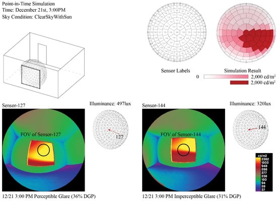 The simulation results of the hemisphere were compared with the DGP analysis using the location of two of the highlighted sensors. Figure 10 illustrates the selected sensors reading over 2000 cd/m2, and the false color HDR analysis of the same sensors but without the digital meter. As previously explained, the sensors with the digital meter have much smaller FOV. Therefore, the results cover a smaller area. The HDR analysis allowed for a quick comparison between the luminance values received by the sensors on the hemisphere and the luminance and DGP values on the HDR rendering. As can be seen in the false color HDR images, both highlighted sensors receive luminance values higher than the 2000 cd/m2 threshold, confirming our results.