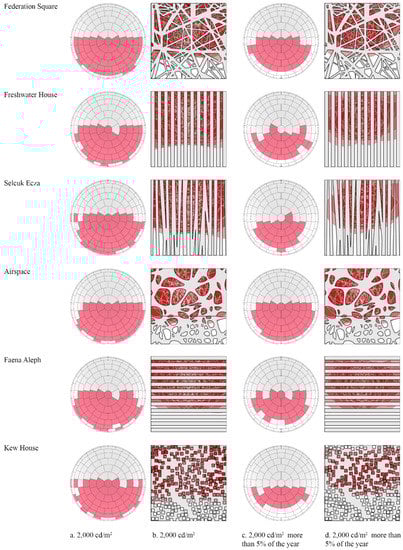 To facilitate easy comparison between the various building skin design options, Figure 11 also illustrates the behavior of the six selected case studies, highlighting the areas of the building skin design that allow over 2000 cd/m2 of daylight to pass through. The hemisphere on the left represents the sensors that receive over 2000 cd/m2, while the hemisphere on the right represents those that read over 2000 cd/m2 more than 5% of the year.
