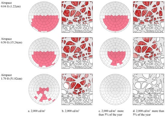 The airspace building skin design was selected as an example to illustrate the effect of thickness on light infiltration (Figure 12). The initial skin design had a thickness of 0.04 ft (1.22 cm), resulting in substantial direct penetration of sunlight. As can be seen in Figure 12, at the end of the simulation, large areas of the skin design are highlighted, representing areas of the design that allow over 2000 cd/m2 (Figure 12a), and similarly areas of the design that allow over 2000 cd/m2 more than 5% of the year (Figure 12c). To eliminate light infiltration over 2000 cd/m2, as a proof of concept, the thickness of the airspace design was gradually increased to 1.7 ft (51.8 cm). Once the simulation was complete, the data were analyzed to evaluate the effect of thickness on light infiltration. As illustrated in Figure 12, the increased thickness of the skin (airspace 1.70 ft) dramatically reduced the light infiltration over 2000 cd/m2 (Figure 12a,b). The data were further filtered to show the areas of the skin design that allow over 2000 cd/m2 more than 5% of the year (Figure 12c,d).