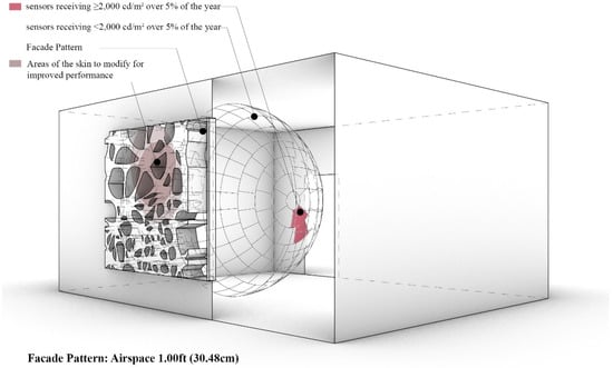 Once each sensor’s viewing vector and FOV are defined, the daylight values from all sensors on the hemisphere can projected onto the building façade design. So, if particular sensors are reading high or low illuminance or luminance values, they can be highlighted, traced back to one specific region of the building skin, and adjustments can be made to the geometry of that area. Figure 11 demonstrates the link between data from the daylight simulation and the building skin design, highlighting the areas of the skin that allow interior luminance ≥2000 cd/m2 over the entire year. The data are further filtered to show the areas of the building skin that allow illumination over a certain threshold, such as 2000 cd/m2 for more than 5% of the year. The thresholds can be defined based on the scope of the project. The minimum recommendation for glare protection is that the daylight glare probability (DGP) for the space does not exceed a value of 0.45 in more than 5% of occupied hours [,]. In this research, a 5% threshold was selected.