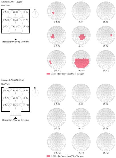 Multiple simulation studies were performed with the hemisphere in different locations in the room to verify whether the previously selected hemisphere location was appropriate and effective for the airspace design. The aim of this investigation was to ensure that the adjustments made to the skin design based on the highlighted areas of the hemisphere in location (0, −2) addressed the overlit areas of all the other hemispheres in the room. The results of this investigation are shown in Figure 14. Using the airspace skin design in two different thicknesses of 1.22 cm and 51.8 cm, Figure 14 shows the sensors on hemispheres in different locations of the room that are reading over 2000 cd/m2 for more than 5% of the year. As can be seen in Figure 14, the selected hemisphere in location (0, −2) highlights all the sensors that are also highlighted in other locations of the room. Thus, adjusting the airspace design based on the overlit areas detected on the hemisphere in location (0, −2) addresses all other overlit areas on the different hemisphere locations in the room.