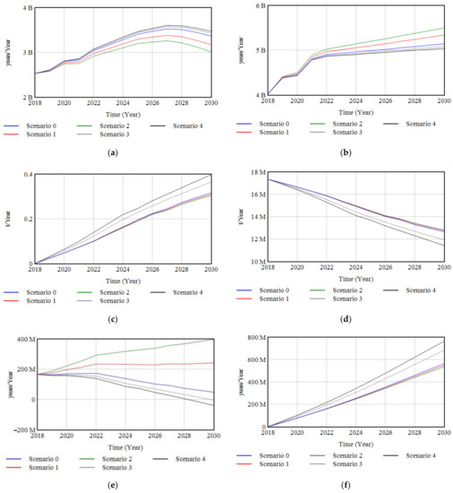 In the second set of experiments, the innovation investment rate in the baseline scenario was changed in Scenarios 3 and 4 to study the effects of additional innovation investment. Most of the leading cement companies put forward plans to increase innovation investment under the pressure of energy consumption control [54]. Therefore, in order to analyze the impact of changes in innovation investment on the competitiveness of companies, Scenarios 3 and 4 set the investment rate to increase by 1.8% and 2%, respectively. In both scenarios, the annual decline factor remained unchanged.
