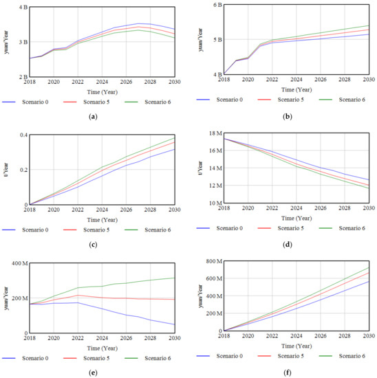 The plots in Figure 8a–g show the simulation results of seven indicators from the third set of experiments under the combined scenarios, compared with the baseline scenario. Scenario 5 is the scenario in which the annual decline factor of the benchmark value and innovation investment rate adjust simultaneously but to a smaller extent than in Scenario 6. The curves representing Scenario 5 all lie between the other two curves representing the baseline scenario and Scenario 6 (Figure 8a–g). In particular, it can be seen from Figure 8e that the annual carbon trading costs tend to stabilize after 2022 under this scenario. This is because with the innovation investment rate of 1.8% and the annual decline factor of 0.97, the reduction in carbon emissions due to emerging technologies is approximately the same as the reduction in carbon quota due to the decrease in the benchmark value. In this case, the annual carbon trading costs would not fluctuate too much, which provides cement companies with some time to adapt to new environmental policies. This is another reason why an annual decline factor of 0.97–0.99 is appropriate.