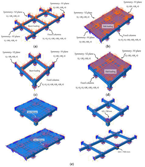 Figure 9 shows specifics on the loading application and boundary conditions of all the specimens. A strip foundation was used in the experimental program to support the tested specimens in the laboratory. The strip foundation was not taken into account in the FE modelling because it requires more demanding computations, and it is assumed to be stiff enough to provide rigid support. Therefore, at the external columns’ bottom surfaces, the supports were implemented by the fixed boundary condition for all rotations (UR) and translations (U) in all directions (i.e., URx, URy, URz, Ux, Uy, and Uz were restrained). By increasing the displacement at the top surface of the middle column (acting vertically downwards), the experimental loading was applied to the middle column until the entire test specimen failed.