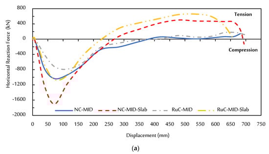 Horizontal reaction force–displacement curves: (a) Scenario “A” specimens and (b) Scenario “B” specimens.
