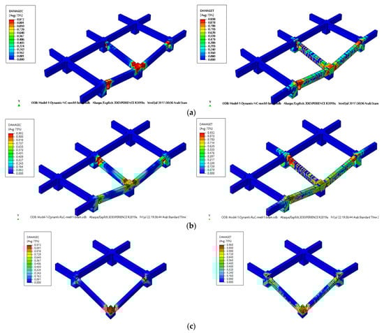 A decline in stiffness and strength is referred to as material failure in a particular structure. Concrete can crack or crush during the loading phases, which results in the loss of the entire load-carrying capacity due to progressive degradation. The erosion algorithm method is utilized to simulate loss of stiffness in the progressive collapse operation and prevent computer overload during the calculation [60,61,62,63]. By using this approach, the model is able of capturing a more accurate graphic picture of how concrete physically fractures (i.e., cracks and crushes) after achieving its maximal strength. In addition, this algorithm can help the FEM simulation address the issue of a huge mesh-distortion by enabling the concrete finite components to erode, despite the fact that this is not a physics-based process. In other words, the physical separation of some finite elements from the rest of the mesh when the FE analysis produces excessive, improbable deformations and stops assisting with load resistance [36,63,64,65]. The erosion limitations and criteria utilized in various research to simulate erosion and spalling in concrete were reviewed by Luccioni et al. [66]. The literature describes a number of erosion procedures, including principal stress, principal strain, shear strain, etc. Despite this, many erosion limit values are in agreement with the results of the experimental tests, the researchers advised expanded research on erosion limits due to a number of discrepancies in the literature that currently exist. To prevent inaccurate predictions from the numerical models caused by early erosion, which goes against the structure’s mass and energy conservation, erosion limits must be utilized with prudence as a small limiting number. In order to accurately anticipate actual damage patterns that are comparable to the findings of experimental tests, an acceptable limiting value should be carefully chosen [60,63,64,67]. The maximum principal strain limitation value was determined based on the literature [62,63,64,65,67,68]. Calibrations using pertinent experimental tests are nevertheless necessary. As a result, numerous values were employed to test the validity of this value, and the results of the simulation and the experiment were compared. As a result, the concrete failure definition in ABAQUS software can be used to model the concrete failure criteria so that it accurately simulates the whole reaction of concrete. The ABAQUS software version of 2019 has added a new function known as the “Concrete Failure” keyword. Without utilizing subroutine functions, this keyword can be utilized to describe element deletion and failure criteria in the CDP model. Based on the tensile cracking displacement or tensile cracking strain, ABAQUS software allows the application of those two tensile failure criteria. The tensile cracking strain, which is determined by the cracking strain (i.e., tensile) and crushing inelastic (i.e., compressive) strain at failure, was used in this work. The values for the maximum principal strains according to the experimental results for the spalling and cracking of concrete were validated after a few trial-and-error calculations, as shown in Table 3.