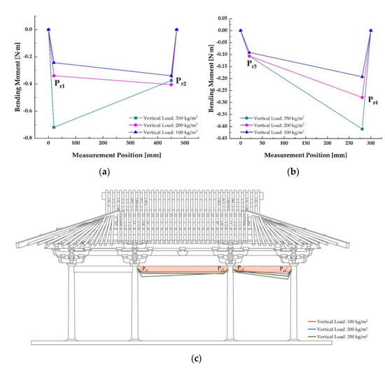 The axial force is the force resisting deformation that extends or retracts in the axial direction of a component. When a vertical load of 350 kg/m2 is applied to the specimen, the first building component to be transferred is Cha Shou, which is compressed and generates axial force. As shown in Figure 15a,b, the axial force is 251 N, which is twice that of the roof load at 200 kg/m2. Tang Dynasty building structures use the triangular Cha Shou to support the transfer of vertical loads, and as the vertical loads increase, so does the axial force at Cha Shou. Therefore, as an important load-bearing element, it should be structurally strengthened in future restoration projects.