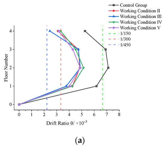 As shown in the above figure, the maximum drift ratio of each floor in site II under four working conditions is much smaller than that of the structure prototype, and the working condition II in site III and IV is significantly smaller than that of the remaining working conditions. The improvement effects of the remaining three working conditions are all greater than those of the structure prototype. After comparison, the maximum drift ratio, drop proportion, and damage state of the structure in different sites are shown in Table 11.