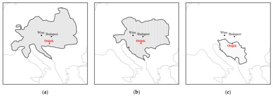 Osijek as a part of different countries: (a) Habsburg Monarchy (since 1687); (b) Austrian–Hungarian Monarchy (1867–1918); (c) The Kingdom of Serbs, Croats and Slovenes (1918–1929) and later the Kingdom of Yugoslavia (1929–1945). Source: authors according to Euratlas (https://euratlas.com/, accessed on 2 October 2021).