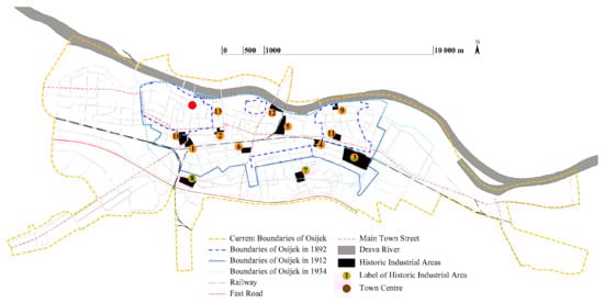 Historical industrial areas can vary in size. Thus, they can be observed at a small-scale level (i.e., the scale of a building), the scale of a part of a city block or a whole block, all the way to a large scale (i.e., a part of a city or an entire city) and even on a landscape scale []. This paper deals with the city of Osijek’s structure of historical industrial areas, and with consequences that decaying of such significant areas has on the city’s urban fabric.
