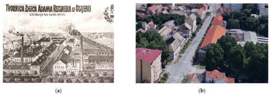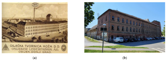 Former industrial area of the Tannery: (a) around 1920 (Source: http://slavonia-baranja-travel.com/wp-content/uploads/2017/04/47.jpg; accessed on 22 December 2021); (b) current (Source: authors, 2021).