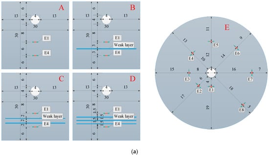 Five kinds of specimens were designed to study the stress wave attenuation law of the weak layer, as shown in Figure 1. Four specimens are square, specimens A–D, as shown in Figure 1. “E1” represents the incident pressure measurement point, and “E4” represents the transmission pressure measurement point. The distance between two measurement points is 6 cm. The dimensions are 30 cm × 30 cm × 20 cm. Specimen A did not have a weak layer. Specimen B has one weak layer, and the distance between the measurement point and the weak layer is 3 cm. Specimen C has two weak layers, and the distance between the measurement point and weak layer is 2 cm. Specimen D has three weak layers, and the distance between the measure point and weak layer is 1.5 cm, as listed in Table 1. The specimens are made into layers and bonded with special glue. The weak layer is made up or 3 mm-thickness mica flakes. There is an explosive hole with a diameter of 4 cm. It is 6 cm away from the top and 13 cm away from the left side.