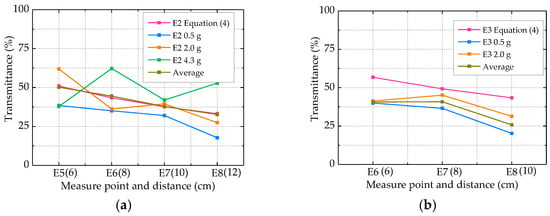 Transmittance in each distance in (a) E2 measure point, (b) E3 measure point, and (c) E4 measure point.
