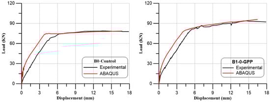 - The failure loads of beams B1-0-GPP, B2-0.60-GPP, and B3-1.2-GPP were greater than control beam B0-Control by approximately 20.80%, 25.60%, and 31.40%, respectively, whereas the failure loads of beams B4-0-EP, B5-0.6-EP, and B6-1.2-EP were greater than the control beam B0-Control by approximately 16.90%, 26.90%, and 26.10%, respectively. The results showed that increasing the SGF ratio in the GPP had a clear effect on raising the capacity of the beam due to the enhanced interfacial bond shear strength. In addition, the GPP had a great effect on increasing the failure load capacity of the tested beams.