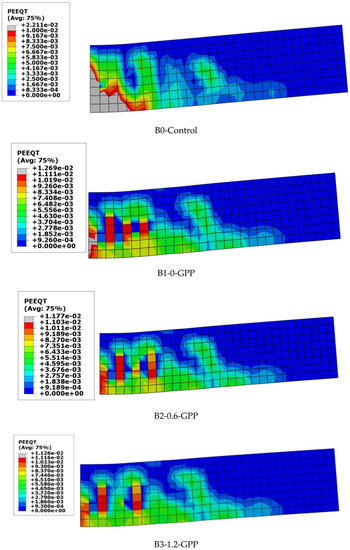 where ti and tc represent the thickness of adhesive and the concrete thickness, respectively. Gi and Gc are the shear modulus of the adhesive and concrete, respectively. The values of shear stress of each resin τmax according to the experimental results used for B1-0-GPP, B2-0.6-GPP, B3-1.2-GPP, B4-0-EP, B5-0.6-EP, and B6-1.2-EP are 4.2 MPa, 4.26 MPa, 4.31 MPa, 3.95 MPa, 4.1 MPa, and 4.2 MPa, respectively (See Figure 3). The damage initiation criterion was described by using the quadratic nominal stress function:
