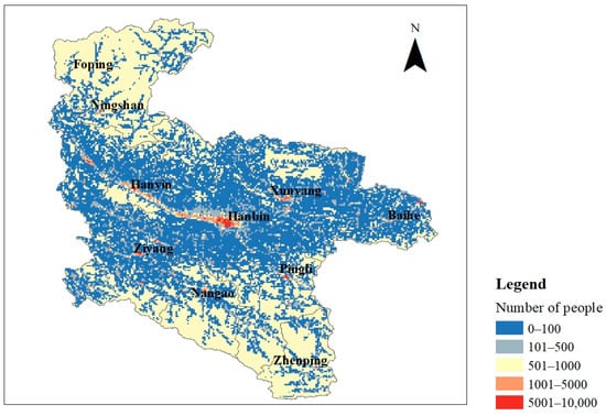 We took the Ankang City in Shaanxi Province as an example for analysis. We set a 30″× 30″ kilometer grid as the calculation unit to process the population and economic data. Based on the population and economic data from the first risk survey, we could obtain the processed population kilometer grid data and GDP kilometer grid data of Ankang City, which are drawn in Figure 1 and Figure 2.