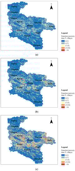 Distribution of seismic resilience capacity of building groups in Ankang City: (a) 50-year probability of exceeding 63%; (b) 50-year probability of exceeding 10%; and (c) 50-year probability of exceeding 2%.