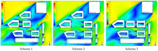 The simulation platform and parameter settings used in the wind environment simulation of six different layouts are the same as in the previous Section 2.3. Figure 14 demonstrates the wind speed contour map. Due to the large volume of the stadium on the northeast side of the site, a significant wind shadow area appears on the southwest side of the stadium, which weakens the airflow within the dormitory area. Different layout modes form squares and passages of varying sizes and locations. When the square is located in the east side, as in scheme 1 and 4, because of the wind shadow area of the gymnasium, it results in lower wind speed. When the square is located in the central part of the area, as in schemes 2 and 5, the presence of the large scale open square and low enclosure of surrounding dormitory buildings result in a significant area of high wind speed. The layout of scheme 5 shows the most significant impact. When the square is located on the north side of the dormitory area, as in scheme 3 and 6, it has less influence on the wind environment. Different dormitory grouping methods also have a greater impact on the wind field. The comparison of scheme 3 and 6 reveals that the high wind speed zone in the open layout is significantly larger than that in the enclosed layout.