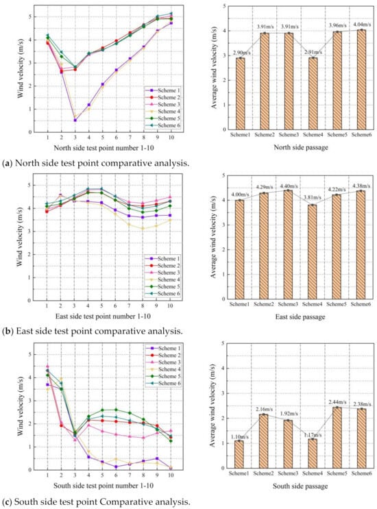 Comparing the wind speed change diagrams of each test point in the east passage, it can be seen (Figure 15b) that the change trend of each scheme is consistent, showing a slight fluctuation from north to south. The difference between wind speed at the north and south ends and the middle section is not significant. The average wind velocity comparison is as follows: scheme 3 (4.40 m/s) > scheme 6 (4.38 m/s) > scheme 2 (4.29 m/s) > scheme 5 (4.22 m/s) > scheme 1 (4.00 m/s) > scheme 4 (3.81 m/s). There is not much difference between the schemes, and all of them show the characteristics of higher wind speed. This is due to the fact that the east passage is far away from the wind shadow area formed by the stadium and lacks a suitable barrier to alleviate the strong wind. The high-speed airflow passes through the narrow channel between the grandstand and the equipment room causing the wind speed to further increase.