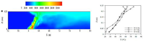 Temperature contours and temperature profiles at critical velocity condition for 1.8 kW fire: (a): no obstacle, (b): obstacle at 0 m from tunnel floor, (c): obstacle at 0.03 m. From tunnel floor 3, (d): obstacle at 0.06 m from tunnel floor [49].