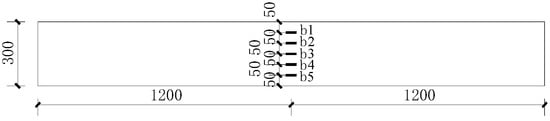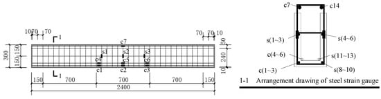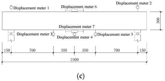 Figure 6 illustrates the bending performance test device and the layout of measurement points for the beam in this experiment. The loading equipment employed was a YAW-5000 pressure testing machine (Changchun New Testing Machine Co., Ltd, China). Two concentrated force points are utilized for loading, creating a pure bending section within the span. The pressure is applied by the jack and the reaction beam, the vertical load is transferred to the beam through the distribution beam, and the load value is measured by the pressure transducer. The experimental loading initially starts with load control at a rate of 0.2 kN/s. Each load increment is 2 kN, and the load is held for 300 s until reaching 30 kN. Then, the loading method switches to displacement control at a rate of 0.5 mm/min. Each displacement increment is 2 mm, and the load is held for 600 s. Once the displacement reaches 30 mm, the displacement increment is changed to 5 mm and the load is held for 600 s. The loading process continues until the displacement reaches 60 mm, at which point the loading is stopped. Seven displacement gauges were utilized to measure the displacements within the beam’s span, including the displacements at the two loading points, supports, and the transverse displacements of the upper and lower sections, as depicted in Figure 6c. Additionally, five concrete strain gauges were positioned on the side of the purely bending section within the span of the beam, as shown in Figure 7. Furthermore, three steel strain gauges were affixed to each tensile longitudinal reinforcement in the purely bending section, and three steel strain gauges were attached to the hoop reinforcement, as illustrated in Figure 8. Throughout the loading process, close attention was paid to crack development, and changes in crack width were recorded using a 150 ×crack observer.