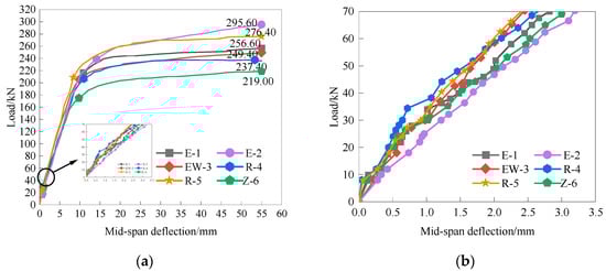 The load–span deflection curves of the six specimens are shown in Figure 10.