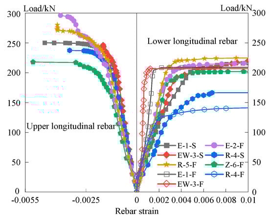 - During the initial loading stages of the test specimens, where the applied load was relatively small, the strain in the reinforcing bars was also small. As a result, the load–strain curves of the test beams subjected to different loading directions were nearly identical.