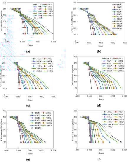 Strain distribution in the specimen sections: (a) specimen E−1; (b) specimen E−2; (c) specimen EW−3; (d) specimen R−4; (e) specimen R−5; (f) specimen Z−6.