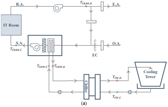 Both the DASE and IASE implement evaporative cooling (EC) on the OA side to lower the OA temperature and extend the duration of the free-cooling operation, as shown in Figure 2a,b.