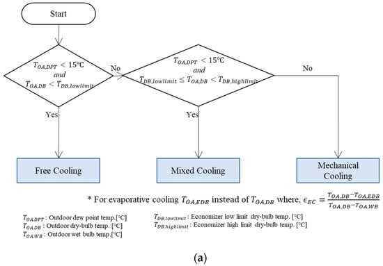 For DASE operation, the decision is determined by the outdoor dry-bulb temperature (), outdoor dew point temperature (), low-limit temperature (, generally the CRAH supply temperature), and high-limit temperature (, generally the CRAH return temperature), as shown in Figure 3a. In the free cooling mode, if is below the upper limit (15 °C) of ASHRAE’s recommended range and is lower than , the DASE system combines return air (RA) and OA to handle the cooling load without involving the chiller. In the mixed cooling mode, when is below the upper limit and falls within the range of and , DASE introduces 100% OA into the space and the chiller operates to maintain the supply air (SA) set points. In the mechanical cooling mode, if are above the upper limit or exceeds , the system recirculates air without mixing in the OA, and the chiller cools the RA to remove the cooling load.