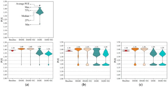 The results of the sensitivity analysis, as depicted in Figure 10, revealed that among the cooling medium temperature settings, the CRAH supply temperature and CRAH temperature difference had a significant impact on the annual PUE. Specifically, for the DASE and DASE + EC systems, the CRAH temperature difference emerged as the dominant factor, followed by the CRAH supply temperature. In contrast, for the IASE and IASE + EC systems, the CRAH supply temperature was the primary influencer, with the CRAH temperature difference exerting the second-most significant effect. The CRAH supply temperature was closely associated with the operation time of the free-cooling mode, as higher CRAH supply temperatures lead to increased utilization of free cooling. However, for DASE or DASE + EC systems, the impact of the CRAH supply temperature was diminished due to humidity constraints (dew point temperature of 15 °C) that restricted the expansion of the Free Cooling mode operation, even when the CRAH supply temperatures were higher. Conversely, as the IASE approach lacks humidity restrictions during the free-cooling operation, the CRAH supply temperature played a more prominent role in influencing the PUE.
