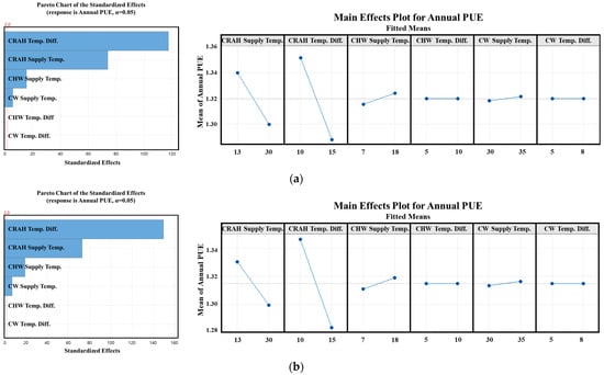 A two-level factorial design was employed to identify the significant factors associated with the cooling medium temperature conditions on PUE. A factorial design is a useful approach when multiple factors influence outcomes, enabling an examination of the significance of each factor and the exclusion of less influential factors. The factors considered for the impact analysis included the CRAH supply temperature, CRAH temperature difference, chilled water supply temperature, chilled water temperature difference, cooling water supply temperature, and cooling water temperature difference. The two-level values for these factors were determined based on the literature [28,35,44,45,46] and are outlined in Table 6.
