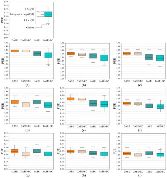 For the DASE and DASE + EC systems, the PUE values of dry zones (1B, 3B, and 4B) exhibited a broader range of uncertainties than those in wet zones (1A, 2A, 3A, and 4A). Notably, this range extended further towards lower values, indicating a greater potential for reducing the PUE in dry zones by adjusting these two factors. For the IASE system, the differences in the PUE uncertainty between the dry and wet zones appeared to be similar. However, for climate zones 0A, 0B, 1A, 1B, and 2A, greater uncertainty was observed compared with that in the other zones, suggesting that variations in the CRAH supply temperature and the CRAH temperature difference have a more significant impact on the PUE in these regions. Consequently, careful consideration should be given to the design of these two factors when implementing IASE or IASE + EC systems in these zones. From region 6A onwards, the uncertainty in the annual PUE was similar across different economizer types. Adjusting the two influencing factors was estimated to lead to a further reduction in the PUE by approximately 0.08 to 0.12 in these zones.