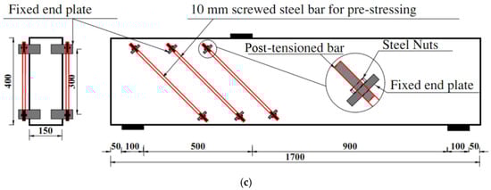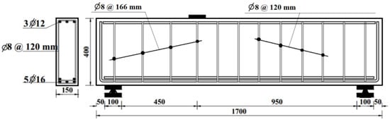A set of test series consisting of seven full-scale RC beams was tested under three-point loading until collapse. The geometric properties were the same for all beams including the beam’s width, height, and length of 150 mm, 400 mm, and 1700 mm, respectively. Based on the previous studies of Fayed et al. [], all beams were reinforced with five bars with a 16 mm diameter and three bars with a 12 mm diameter at the tension and compression zones, respectively. Stirrups with 8 mm diameter spaced each 120 mm along the beam length were used; however, the critically loaded shear span had a greater spacing of 166 mm, giving a smaller ratio to create a weak shear region to be strengthened. Overall dimensions and reinforcement details used for all the RC beams are shown in Figure 1 [].