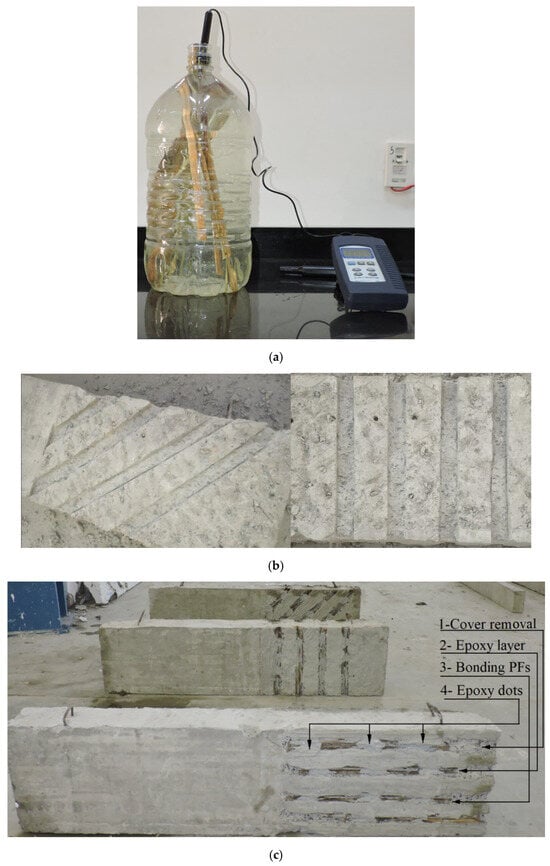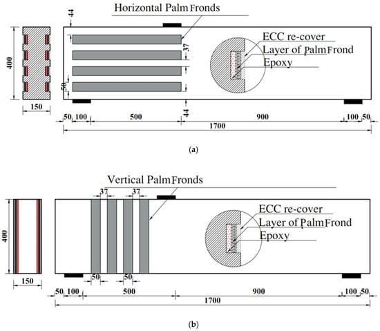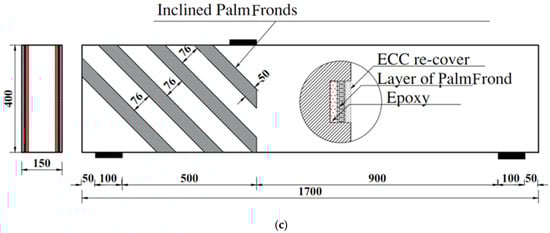 The first beam group depended on the NSM regime for strengthening preparation, which was carried out as shown in Figure 6. To achieve that, 25 mm grooves were made in vertical, horizontal, and inclined positions on both sides of the strengthened zone of the tested beams using a cutter machine, as seen in Figure 6b. For compatibility purposes, the existing concrete, newly added PFs, and ECC must be bonded together perfectly. To ensure a perfect bonding between the existing concrete and the new ECC layer, the grooves were roughened as much as possible. The cured strips of PFs were then completely bonded along the prefabricated specified grooves using chemical epoxy applied on three inner sides sandwiching the PFs, followed by some tiny patches being externally added, as shown in Figure 6c. Finally, ECC was applied up to the beam’s surface to cover and level the removed part up to the outer beam’s surface. The thickness of the epoxy was just to fill the groove; however, the ECC was employed just to re-cover and level the removed part up to the outer beam’s surface, as shown in Figure 6. It should be noted that the width of the PF strip was about 20 mm, and in order to fill the grooves, two strips were used giving two Palm Fronds with 40 mm to be rested easily over the epoxy that existed inside the groove.